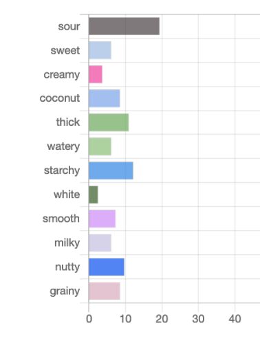 The Pivot test, in comparison, yielded a different group of descriptors based on the free comments. Panelists who were familiar with the product sensory space used their own words to describe the yogurts. A semantic review of the terms led to the identification of key descriptors such as: sour, sweet, creamy, coconut, nutty, grainy, white, starchy, milky, watery, and smooth.